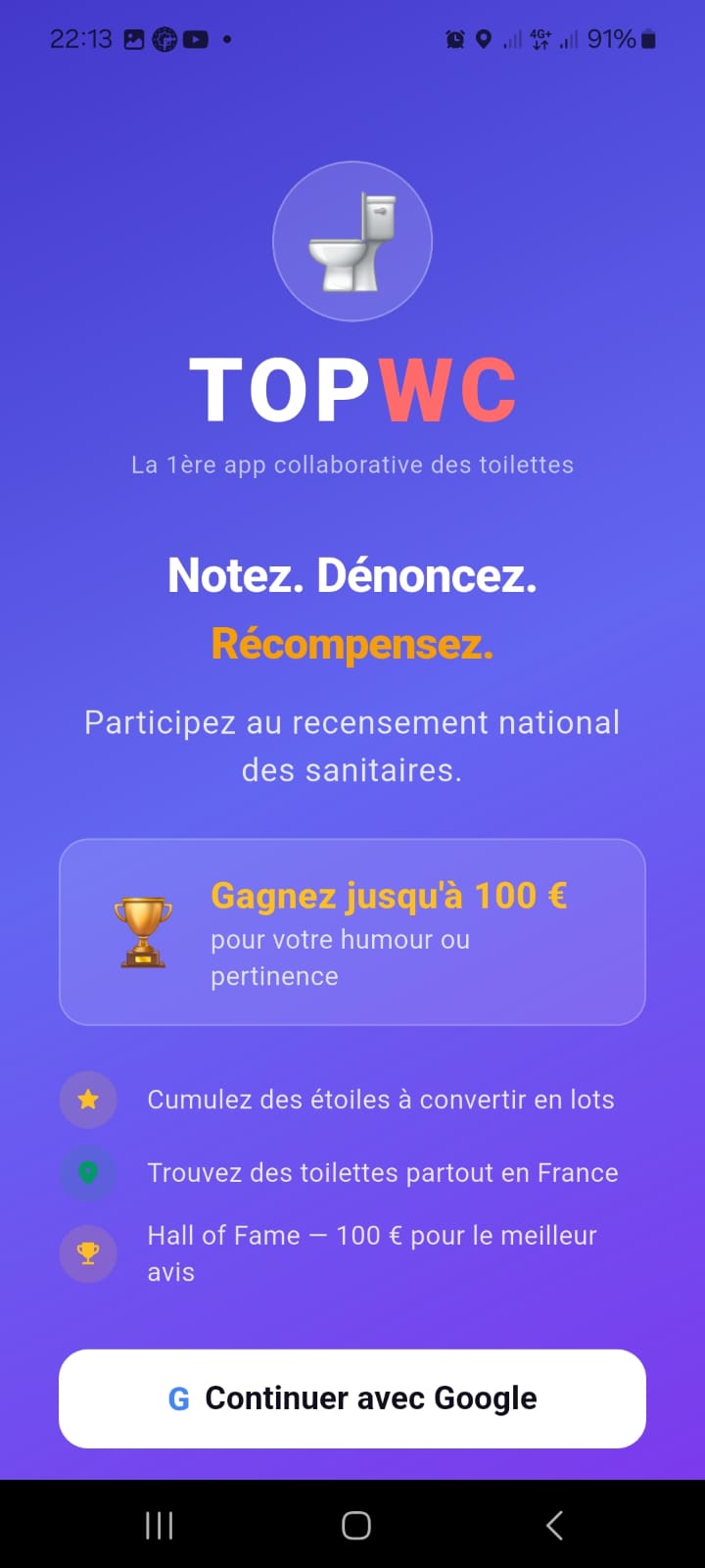 TOP WC est l'application qui vous permet de gagner 100 euros en commentant les toilettes que vous visitez. Partagez votre avis, notez les WC et transformez chaque passage en opportunité de gain !